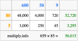 Finally, we add up all the sums we found in step 3 to get our final answer to 659 times 85.