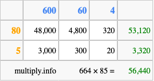 That's all there is to it! As you can see from the box above, the answer to 664 times 85 using the box method is 56,440.