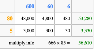 That's all there is to it! As you can see from the box above, the answer to 666 times 85 using the box method is 56,610.