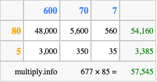 That's all there is to it! As you can see from the box above, the answer to 677 times 85 using the box method is 57,545.