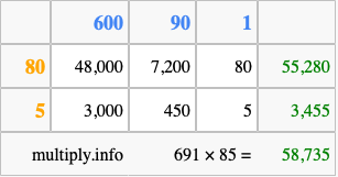 Below is an illustration showing you how to calculate 691 times 85 using the box method, using the instructions above.