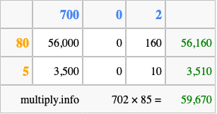 Finally, we add up all the sums we found in step 3 to get our final answer to 702 times 85.
