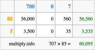 Finally, we add up all the sums we found in step 3 to get our final answer to 707 times 85.