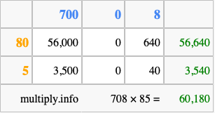 Below is an illustration showing you how to calculate 708 times 85 using the box method, using the instructions above.