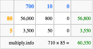 Below is an illustration showing you how to calculate 710 times 85 using the box method, using the instructions above.