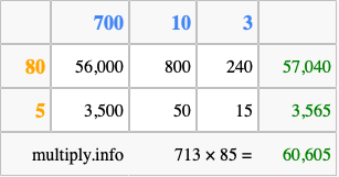 Finally, we add up all the sums we found in step 3 to get our final answer to 713 times 85.