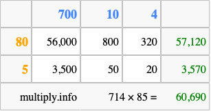 Finally, we add up all the sums we found in step 3 to get our final answer to 714 times 85.