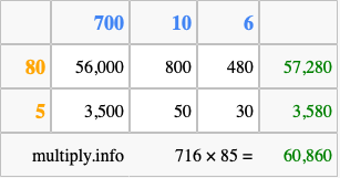 Finally, we add up all the sums we found in step 3 to get our final answer to 716 times 85.