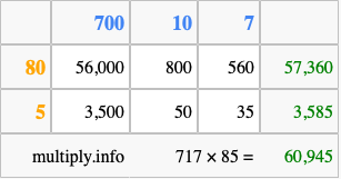 Finally, we add up all the sums we found in step 3 to get our final answer to 717 times 85.