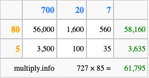 Finally, we add up all the sums we found in step 3 to get our final answer to 727 times 85.