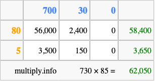 Finally, we add up all the sums we found in step 3 to get our final answer to 730 times 85.