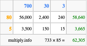 Finally, we add up all the sums we found in step 3 to get our final answer to 733 times 85.