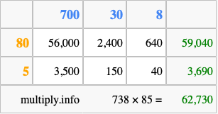 Finally, we add up all the sums we found in step 3 to get our final answer to 738 times 85.