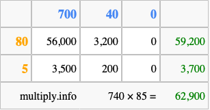 Finally, we add up all the sums we found in step 3 to get our final answer to 740 times 85.