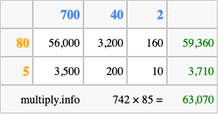 Finally, we add up all the sums we found in step 3 to get our final answer to 742 times 85.
