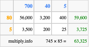Finally, we add up all the sums we found in step 3 to get our final answer to 745 times 85.