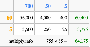 Finally, we add up all the sums we found in step 3 to get our final answer to 755 times 85.