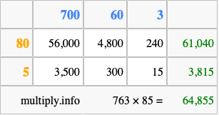 Finally, we add up all the sums we found in step 3 to get our final answer to 763 times 85.