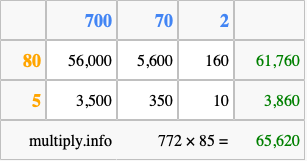 Below is an illustration showing you how to calculate 772 times 85 using the box method, using the instructions above.