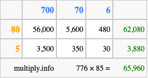 Finally, we add up all the sums we found in step 3 to get our final answer to 776 times 85.