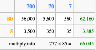 That's all there is to it! As you can see from the box above, the answer to 777 times 85 using the box method is 66,045.