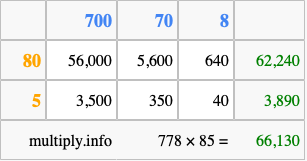 Finally, we add up all the sums we found in step 3 to get our final answer to 778 times 85.