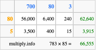 Finally, we add up all the sums we found in step 3 to get our final answer to 783 times 85.