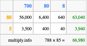 Finally, we add up all the sums we found in step 3 to get our final answer to 788 times 85.