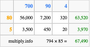 Finally, we add up all the sums we found in step 3 to get our final answer to 794 times 85.