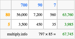 Finally, we add up all the sums we found in step 3 to get our final answer to 797 times 85.