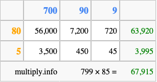 Finally, we add up all the sums we found in step 3 to get our final answer to 799 times 85.