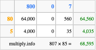 Finally, we add up all the sums we found in step 3 to get our final answer to 807 times 85.