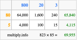 Finally, we add up all the sums we found in step 3 to get our final answer to 823 times 85.