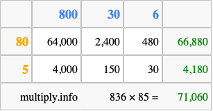 Finally, we add up all the sums we found in step 3 to get our final answer to 836 times 85.