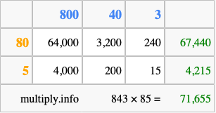 Finally, we add up all the sums we found in step 3 to get our final answer to 843 times 85.