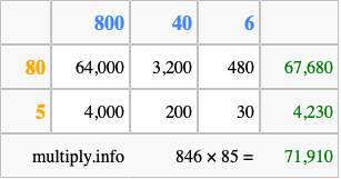Finally, we add up all the sums we found in step 3 to get our final answer to 846 times 85.