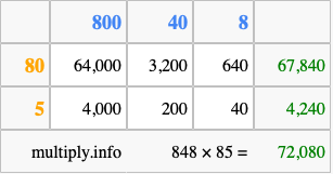 That's all there is to it! As you can see from the box above, the answer to 848 times 85 using the box method is 72,080.