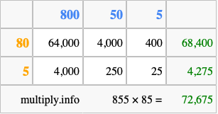 That's all there is to it! As you can see from the box above, the answer to 855 times 85 using the box method is 72,675.