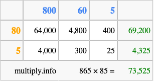That's all there is to it! As you can see from the box above, the answer to 865 times 85 using the box method is 73,525.