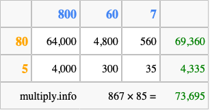 Finally, we add up all the sums we found in step 3 to get our final answer to 867 times 85.