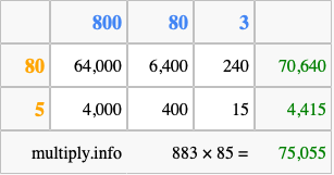 Finally, we add up all the sums we found in step 3 to get our final answer to 883 times 85.