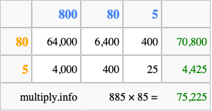 Finally, we add up all the sums we found in step 3 to get our final answer to 885 times 85.
