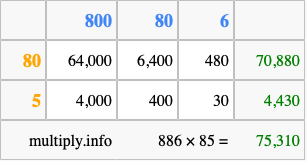 Finally, we add up all the sums we found in step 3 to get our final answer to 886 times 85.