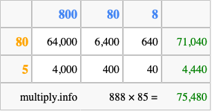 Finally, we add up all the sums we found in step 3 to get our final answer to 888 times 85.