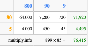 Finally, we add up all the sums we found in step 3 to get our final answer to 899 times 85.