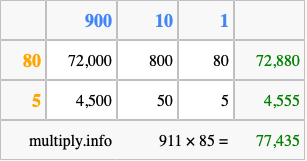 That's all there is to it! As you can see from the box above, the answer to 911 times 85 using the box method is 77,435.