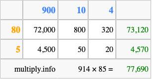Finally, we add up all the sums we found in step 3 to get our final answer to 914 times 85.