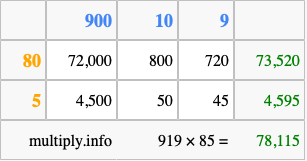 Below is an illustration showing you how to calculate 919 times 85 using the box method, using the instructions above.