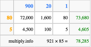 Finally, we add up all the sums we found in step 3 to get our final answer to 921 times 85.