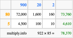Finally, we add up all the sums we found in step 3 to get our final answer to 922 times 85.